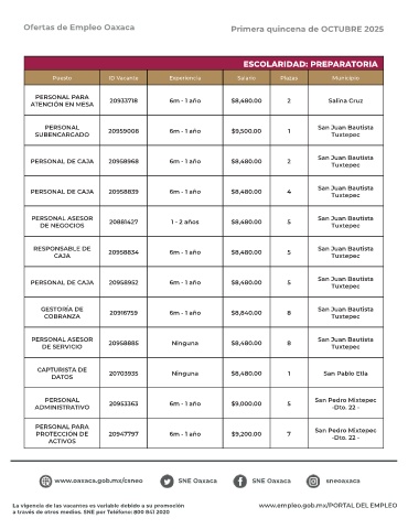 Ofertas de Empleo Oaxaca Primera quincena de OCTUBRE 2025